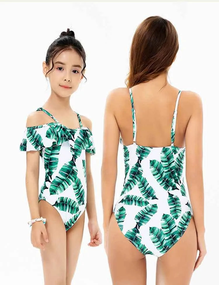 بدلة سباحة متطابقة للعائلة مطبوعة بأوراق الشجر