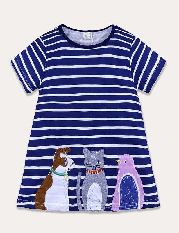 - Say hello to cutie animals. They're gathered in appliqué form around the hem of this soft cotton dress. It feels cool on sunny days, and there are gathers at the high waist to give the skirt breezy fullness.